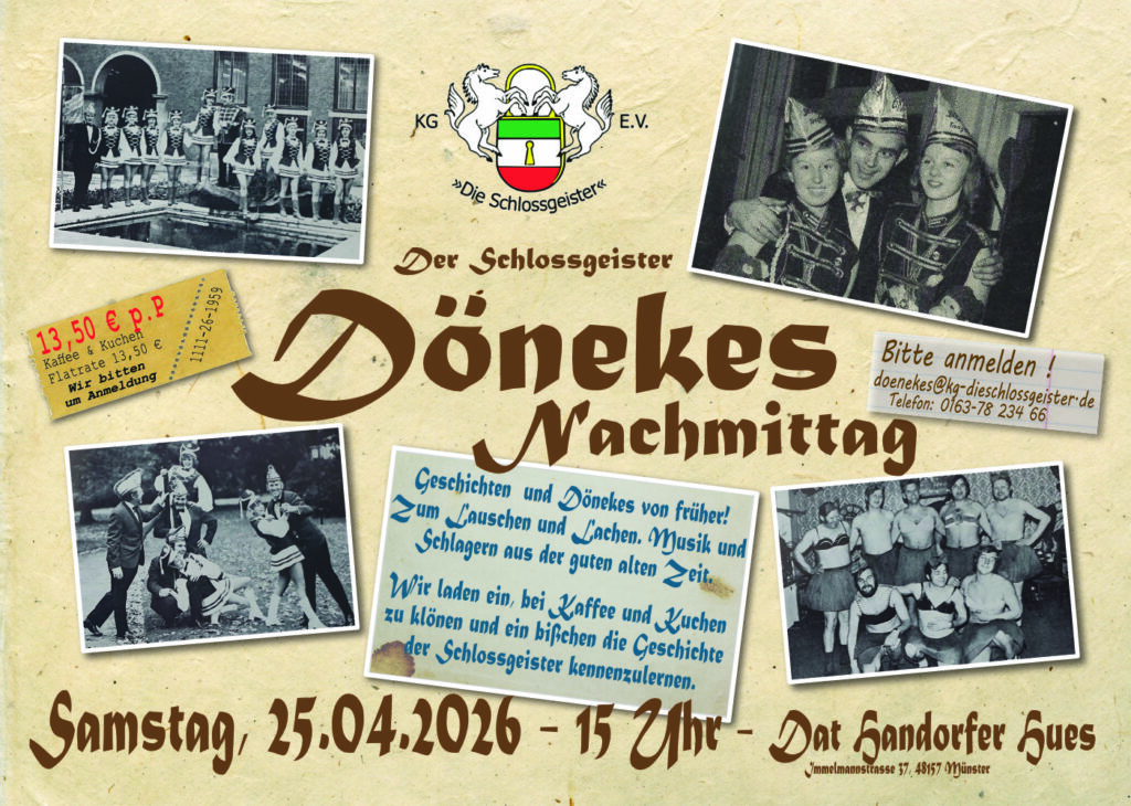 Bei Kaffee und Kuchen möchten wir in lockerer Runde im Handorfer Hues ein paar Dönekes aus der älteren und früheren Zeit der Schlossgeister lauschen und uns über die gute alte Zeit unterhalten und auch in alten Erinnerungen schwelgen.